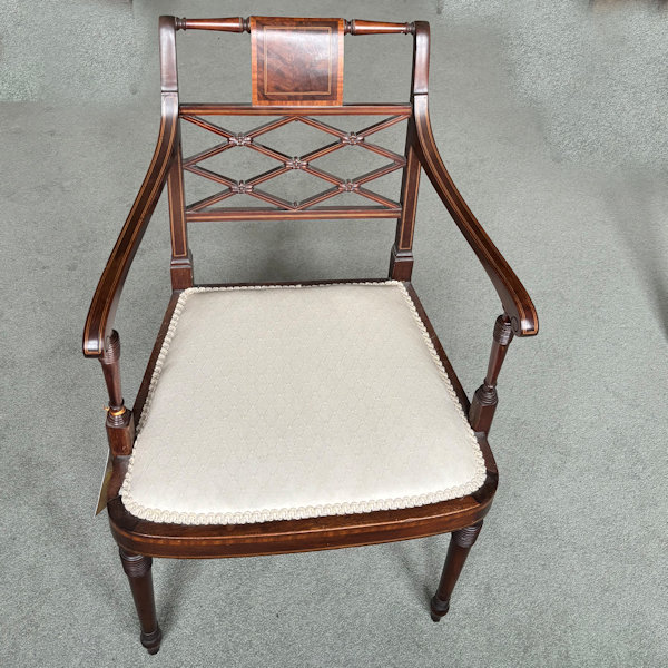 Antique Stock / Chairs / Arm Chairs / Edwardian Mahogany Elbow Chair Edwardian Mahogany Elbow Chair Edwardian inlaid mahogany elbow chair in the Sheraton Style C. 1910 Price: £270 Enquire about this Antique < Back to Arm Chairs