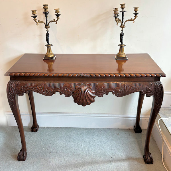 A mid 18th C carved mahogany console table on ball and claw feet